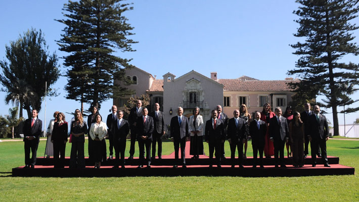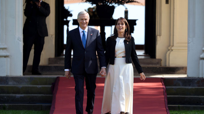 Con colores oscuros y el negro predominando, las nuevas autoridades posaron sobre una grada roja y un día soleado en sus espaldas luego de que el mandatario llegará junto a la primera dama, María Pía Adriasola.
