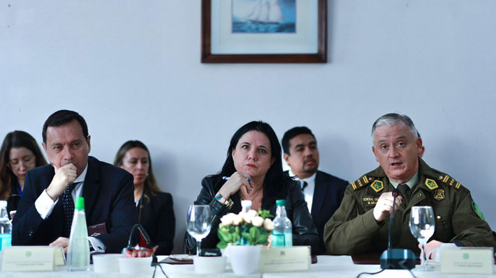 La ministra de Seguridad, Trinidad Steinert (al centro) encabezó esta mañana una reunión junto al General Director de Carabineros, Marcelo Araya (derecha), y al Director General de la PDI, Eduardo Cerna (izquierda).