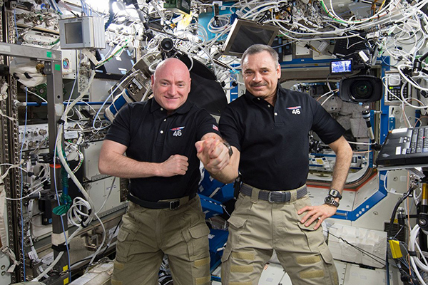 En la foto, Scott Kelly y Mikhail Kornienko, a bordo de la Estación Espacial Internacional.