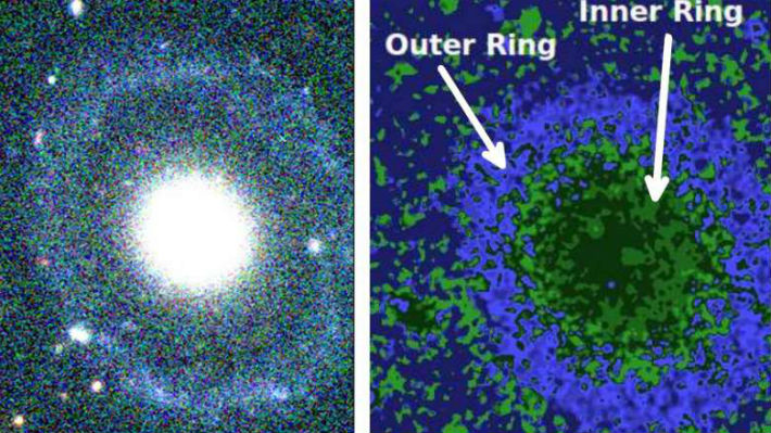 A pesar de que los astrofísicos ya habían observado galaxias con un anillo azul alrededor de un cuerpo central rojo, en este caso la característica especial es que parece existir un anillo interior más antiguo y difuso, señaló Patrick Treauthardt del Museo de Ciencias Naturales de Carolina del Norte.