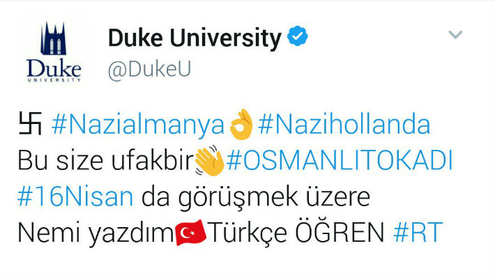 "Alemania nazis #Holanda nazis. Aquí una pequeña bofetada otomana para ustedes. #Nos vemos el 16 de abril. ¿Quieren saber lo que escribí? Aprendan turco", rezaba hacia las 07:00 horas (16:00 horas en Chile) un mensaje en turco que apareció también en las cuentas de Javi Martínez, jugador del club de fútbol Bayern de Múnich, y del ex tenista alemán Boris Becker, entre otros.