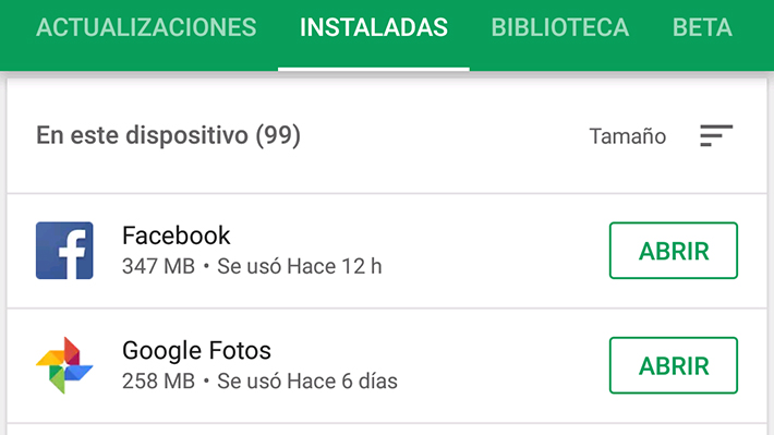 Pero el cambio más importante está en la pestaña "Instaladas", que muestra una lista de todos los programas descargados desde la tienda, con la posibilidad de ordenarlos en base a cuatro criterios: nombre (orden alfabético), última actualización, último uso y tamaño. Son estos dos últimos parámetros los que entregan mayor utilidad a Google Play.