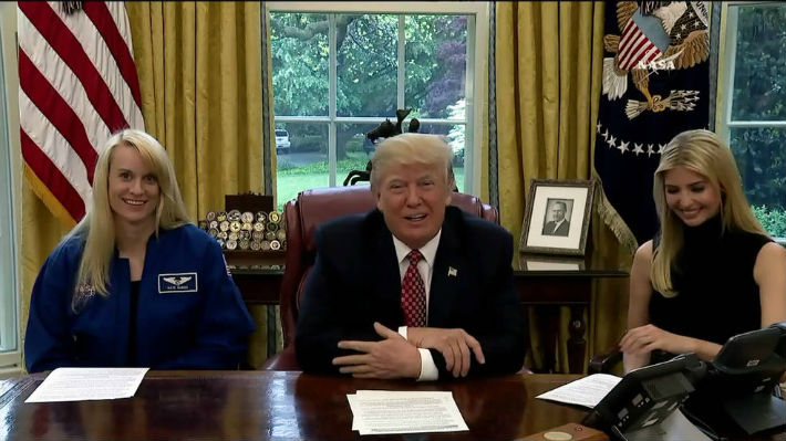 Desde el Despacho Oval, sentado junto a su hija Ivanka y la astronauta Kate Rubins, Trump felicitó a Whitson "en nombre de toda la nación" por su "increíble récord".