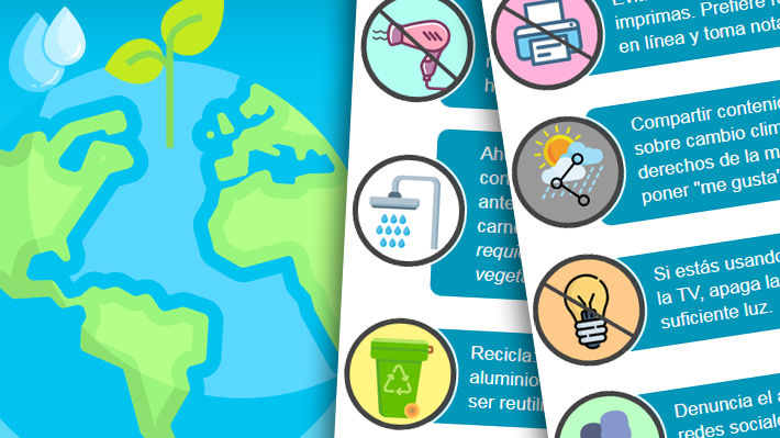 ![]() | Ahorra agua: toma duchas más cortas, no enjuagues los platos antes de lavarlos. Come menos carne y pescado. (Su producción requiere más recursos que la de vegetales). |