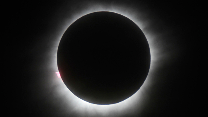 La atención se centra sobre todo en la capa más externa de la atmósfera del Sol, la corona solar. Este halo de gas se puede observar bien durante los eclipses solares porque el Sol queda tapado completamente por la Luna. La capa que se encuentra directamente debajo, la cromosfera, también podrá verse como un anillo blanco rosáceo.