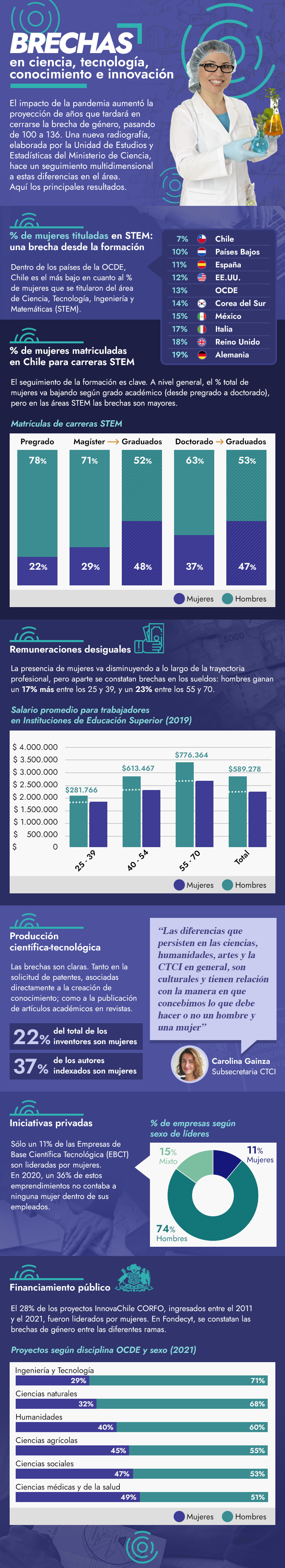 Un estudio impulsado por el Ministerio de Ciencias identificó cómo la desigualdad persiste en el campo laboral asociado a distintas disciplinas como la ingeniería, la medicina y la innovación, entre otros. Donde no sólo las mujeres son menos, sino que reciben menos financiamiento y cargos directivos.