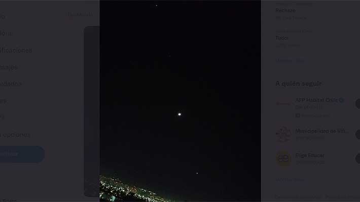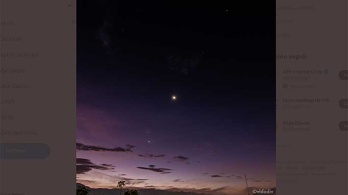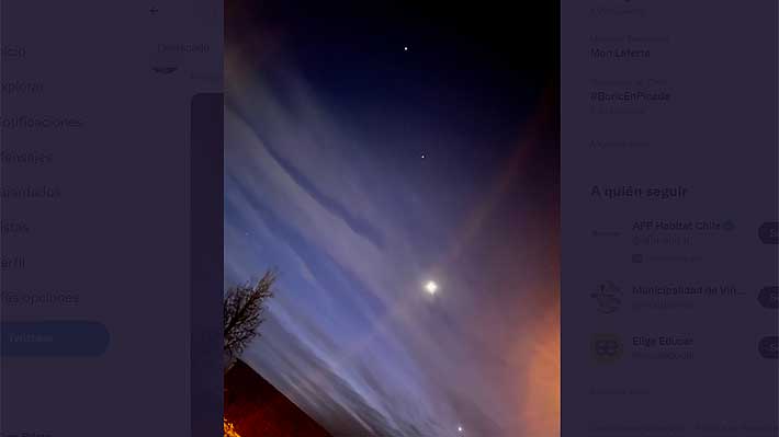 La Luna y dos de los cinco planetas en una fotografía tomada por la periodista Verónica Franco. Crédito: @verfranco / Captura Twitter.