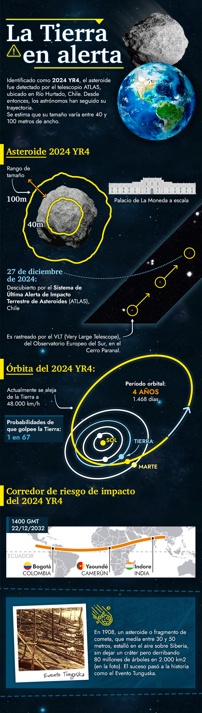 El asteroide 2024 YR4, tiene un diámetro estimado de entre 40 y 90 metros, y una posibilidad del 1,5 % de impactar contra la Tierra el 22 de diciembre de 2032.
