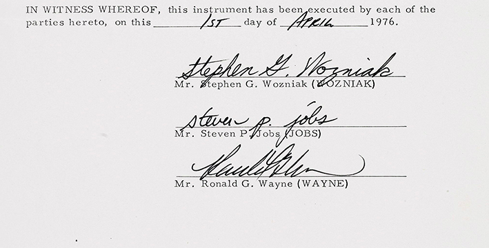 Sin embargo, un tercer hombre firmó junto a ellos el contrato de tres páginas que lanzó la empresa el 1 de abril de 1976: Ronald Wayne.