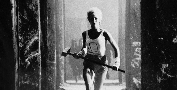 En un mundo totalitario futurista, un martillo lanzado por un joven atleta destroza a una figura de "Gran Hermano" que declama a ciudadanos adoctrinados desde una inmensa pantalla.