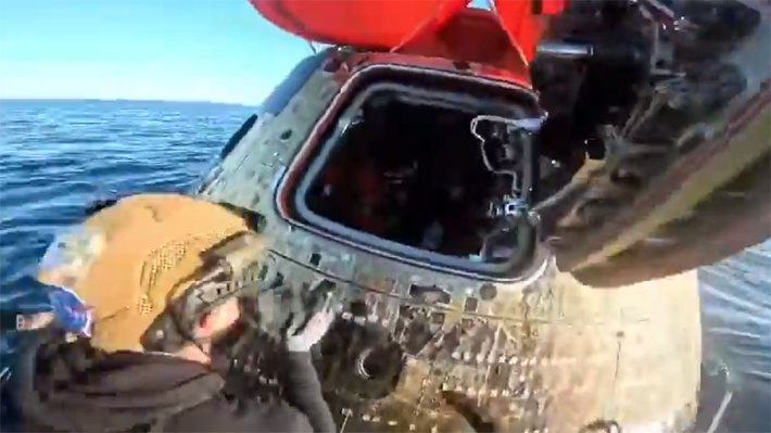"Bienvenidos a casa", expresan a los astronautas dos rescatistas que ingresan a la estrecha nave espacial que llevó a cuatro humanos a más de 400 mil kilómetros de la Tierra.