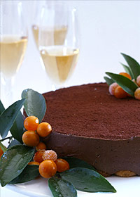 1 paquete de galletas de champaña, 1/4 taza de ron mezclado con 1/2 taza de agua y 1 cucharada de azúcar, 500 gr de chocolate amargo picado, 2 hojas de gelatina sin sabor, 1/4 taza de glucosa o miel, 1/2 litro de crema fresca, cáscaras de naranjas o quinotos confitados.