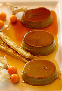 En un bowl mezclar con cuchara de palo los huevos, las yemas y el azúcar rubia. Colar la leche con especias e incorporar a la mezcla anterior. Verter en los moldecitos preparados y poner al horno a bañomaría por alrededor de 3 minutos o hasta que estén firmes al centro.