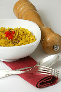 En una olla dorar la cebolla en el aceite por 2 minutos. Agregar las especias, la hoja de laurel y sal y revolver por unos minutos para que salgan los aromas. Incorporar el arroz y cuando esté bien bañado de aceite y especias, agregar el agua hirviendo. Revolver, tapar bien y poner a fuego lento por 15 minutos o hasta que el arroz esté tierno. Tapar durante 5 minutos poniendo papel absorbente. Revolver con un tenedor y sacar la hoja de laurel, palo de canela y vaina de cardamomo antes de servir.