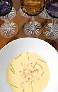 Moler en la juguera el melón, el cebollín y yogur. Aliñar con sal y dejar durante tres horas en el refrigerador. Servir con el jamón o los camarones y ciboulette.