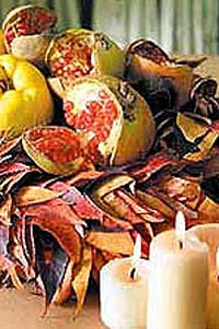 Granadas y membrillos, las frutas símbolo de la estación, comparten la tonalidad y la textura, sumándose armónicamente a la propuesta.