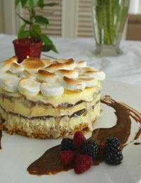 Gratinar el postre por un minuto en un horno con el grill. La superficie debe quedar completamente gratinada y dorada. Servir de inmediato con la salsa de chocolate restante.