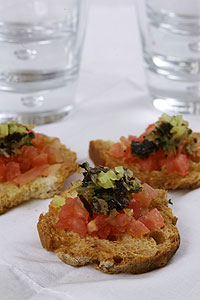 Para preparar la bruschetta: Cortar los panes de forma alargada y meter al horno con aceite de oliva diez minutos a fuego alto. Cortar los tomates en dados y salpimentar. Picar el ají sin sus venas y reservar.