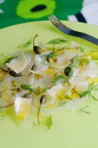 150 gramos de filete de congrio sin espinas, 1/2 taza de limón de pica, 1 cucharada de eneldo fresco picado, 1 cucharadita de ralladura de limón sutil o de pica, 1 echalota picada en cubos, 1/2 taza de rabanitos en cubo, pimienta fresca, 1 cucharada de pepinillo dill en cubos, 4 cucharadas de parmesano rallado, 2 cucharadas de aceite de oliva.