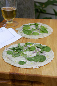 4 tortillas mexicanas, 50 gramos de roquefort o gorgonzola mezclado con 2 cucharadas de yogur natural, 2 echalotas a pluma, 1 taza de rúcula, 1 taza de berros, 1 cucharada de aceite de oliva.