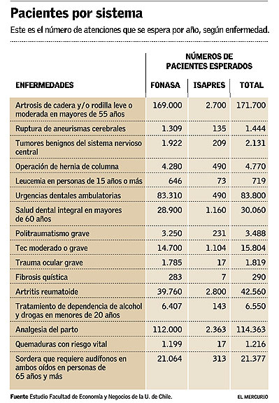 Se espera que más de 500 mil chilenos de Fonasa e isapres usen las coberturas para las nuevas enfermedades, de los cuales la mitad utilizaría la garantía para la artrosis (170 mil personas) o el parto (114 mil personas).