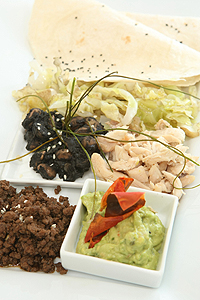 Para servir, precalentar las tortillas de maíz y rellenar con pollo, carne y guacamole. Se pueden sumar como acompanamiento crema ácida o yogurt natural sin edulcorante; queso mantencoso rallado y porotos negros.