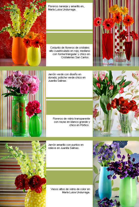 Llamativos colores, exuberantes formas y ricas texturas abundan entre las flores de primavera y verano. Entonces, diviértase combinándolas y contrastándolas entre sí en entretenidos jarrones transparentes o de fuertes tonos.