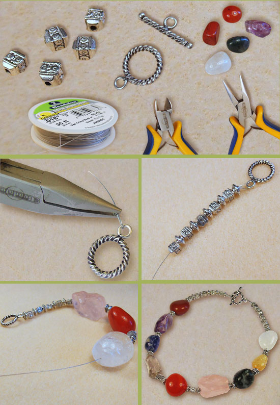 1 alicate para cortar; 1 alicate para apretar; 2 aprietes; 1 cierre timón; 50 separadores; 9 piedras grandes con orificio (cuarzo rosa, amatista,cuarzo ahumado, ágata musgo, jaspe rojo, cornalina, citrino,sodalita,cuarzo transparente; 50 cms de acero.
