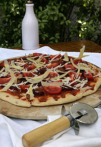 Sobre la masa (ver receta 1) disponer la salsa de tomate, los tomates de cóctel partidos en 2 y los tomates deshidratados. Salpimentar y chorrear 2 cucharadas de aceite de oliva y cocinar durante 15 minutos a fuego medio.