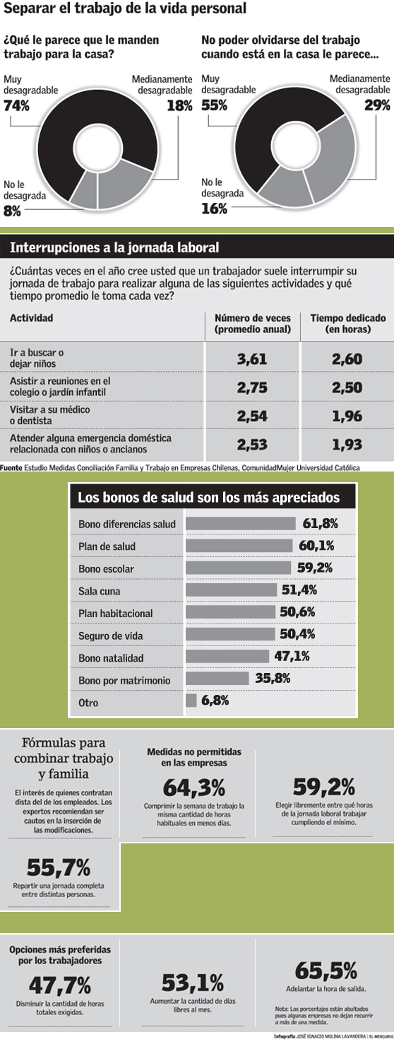 Partir a casa y dejar de pensar en el trabajo, así como poder permanecer más horas en la oficina para ganar días libres, son los deseos de los trabajadores chilenos de acuerdo a un estudio realizado por la Escuela de Administración UC y ComunidadMujer a 25 grandes empresas.