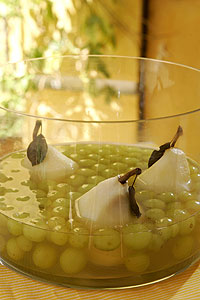 6 peras, 1 taza de vino blanco, 4 tazas de agua, 1/2 taza de jugo de limón, 1 taza de azúcar, 300 gramos de uvas blancas.
