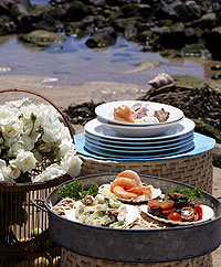 Colocar por separado las tres ensaladas: papas, pollo y tomates. Espolvorear la ensalada de pollo con el resto del queso.