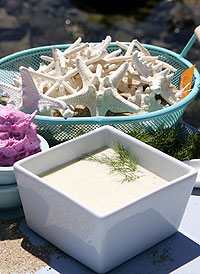Verter a la licuadora y hacer un puré con la mezcla. Sazonar con sal y pimienta y refrigerar la sopa por lo menos 4 horas. Al momento de servir, colar la sopa e incorporar la crema ácida y resto de eneldo.