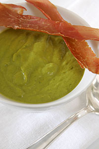 Saltear la cebolla en aceite con el azúcar hasta cocinar. Agregar la zanahoria y la papa, luego las arvejas. Añadir consomé y curry. Hervir a fuego suave por 15 minutos o hasta que la papa y la zanahoria estén bien cocidas. Licuar, volver a la olla, agregar la taza de leche o un poco más hasta obtener la consistencia adecuada. Calentar y servir. Decorar con láminas de prosciutto.