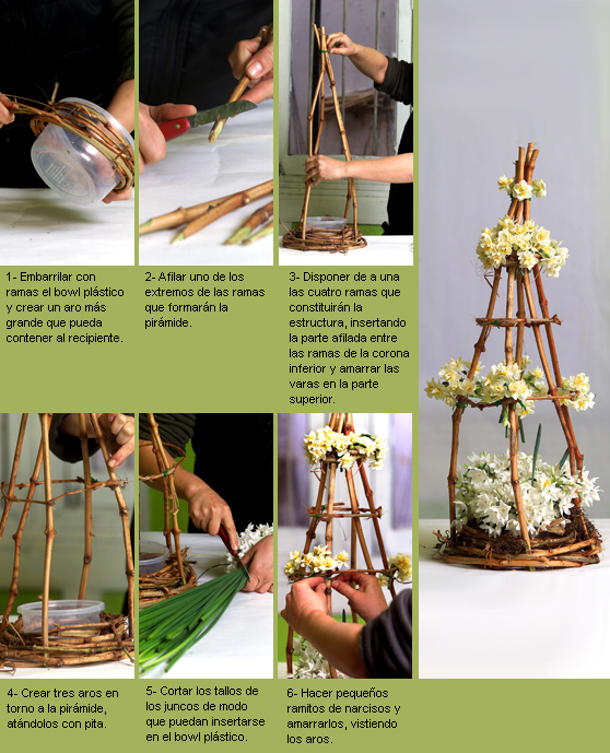 Materiales: 20 varas de sarmiento de 40 cm; alambre de florista; bowl plástico de 20 cm diámetro; pitilla; 4 paquetes de narcisos y juncos.