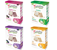 Twistos que son elaboradas en base a cuatro cereales naturales: trigo, arroz, avena y maíz, y que se puede disfrutar al desayuno o en los aperitivos. Vienen en cuatro sabores: Multicereal, Integrales, Moras Silvestres y Arándanos del Bosque y se pueden acompañar de mermeladas, salsas cremas, quesos o patés.