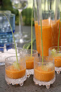 Servir en vasos cortos con el parmesano, el apio en cubos y pimienta roja.