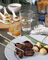 Saltear las albóndigas en el resto del aceite de oliva hasta que se doren. Reservar y servir con un palo de brocheta y con 1 hoja de menta.