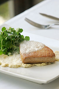 Cortar el atún en cuatro porciones iguales y reservar tapado. Lavar en abundante agua fría los fondos de alcachofas y luego colocarlos en una cacerola junto con la mitad de la crema de leche y calentar sin que llegue a hervir.