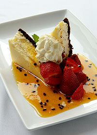 Para el montaje, cortar en triángulos el chesse cake y colocar sobre el las frutillas y bañar con la salsa de maracuyá con pepas.