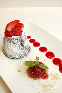Colocar en el plato y acompañar con la salsa de frambuesa, el sorbet y las frutillas cortadas.