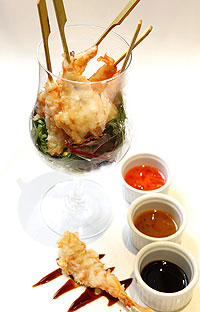 Colocar cada camarón en un palito de brocheta colocar sal y pasar por el batido cuidando que queden bien cubiertos. Freír inmediatamente durante poco tiempo, sólo lo suficiente para que el camarón se cocine y no tanto para que el batido no se oscurezca. Servir sobre las hojas y acompañados de las salsas, teriyaki y BBQ.
