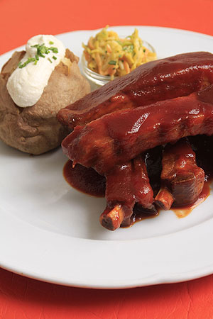Poner sobre un plato 4 costillas, sobre estas verter un poco de salsa previamente calentada, a un costado la papa y la colslaw.