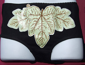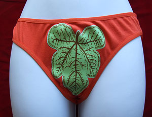 La ropa para hombres tiene una gran hoja de higuera, mientras que el sostén para las mujeres tiene forma de dos manos.
