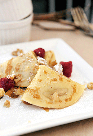 En una sartén a fuego medio, agregar el azúcar con un poco de agua y realizar un caramelo, añadir la crema sin lactosa sin dejar de revolver, e incorporar las nueces. Dejar enfriar y rellenar los panqueques con la preparación. Decorar con las frambuesas y servir.