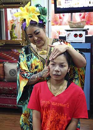 Ataviada con una extravagante túnica azul, tantas flores sujetas al pelo que parece portar un florero y con un montón de baratijas y amuletos dorados entorno a las muñecas y cuello, Khemmikka cachea y hasta golpea con los puños las carnes de su paciente siguiendo el ritmo marcado por canciones tailandesas o algún tema de Lady Gaga.