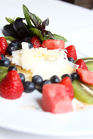 100 grs. Grana Padano, 100 grs. Manchego, 100 grs. Trovero forte, 100 grs. arándanos, 100 grs. kiwi, 100 grs. frutillas, 100 grs. sandia, 100 grs. albahaca mixta.