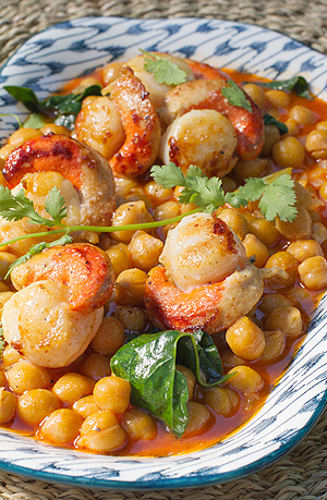 Antes de servir, calentar muy bien una sartén con un poco de aceite y cuando empiece a humear poner los ostiones y dejar que se doren bien por una cara. Esto tomará un poco más de un minuto si la temperatura es bien alta. Dar vuelta y dejar un minuto más. Salpimentar y servir sobre el guiso de los garbanzos agregando al jugo que se pueda recuperar del sartén.