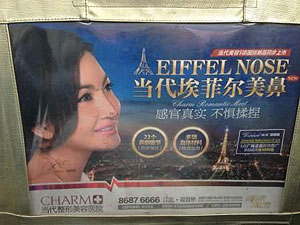 En la publicidad de la "nariz Torre Eiffel" de Wang Xuming, se ve a una joven occidental de ojos claros y nariz recta, perfecta según los criterios europeos, frente a las elegantes curvas del célebre monumento parisiense.