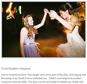 "En mi mente serías una bestia terrible y a mi hija no le gustaría que tú fueras su madre (…) Cuando te conocí por primera vez admito que no eras lo que tenía en mente y que una punzada de celos se disparó a través de mi cuerpo. Se supone que serías horrible, ¿recuerdas? Pero no, eras increíblemente hermosa. Se supone que serías una bruja de mediana edad, ¿recuerdas? Pero no, eras una joven y dulce mujer. Mis planes fueron frustrados", sostiene.